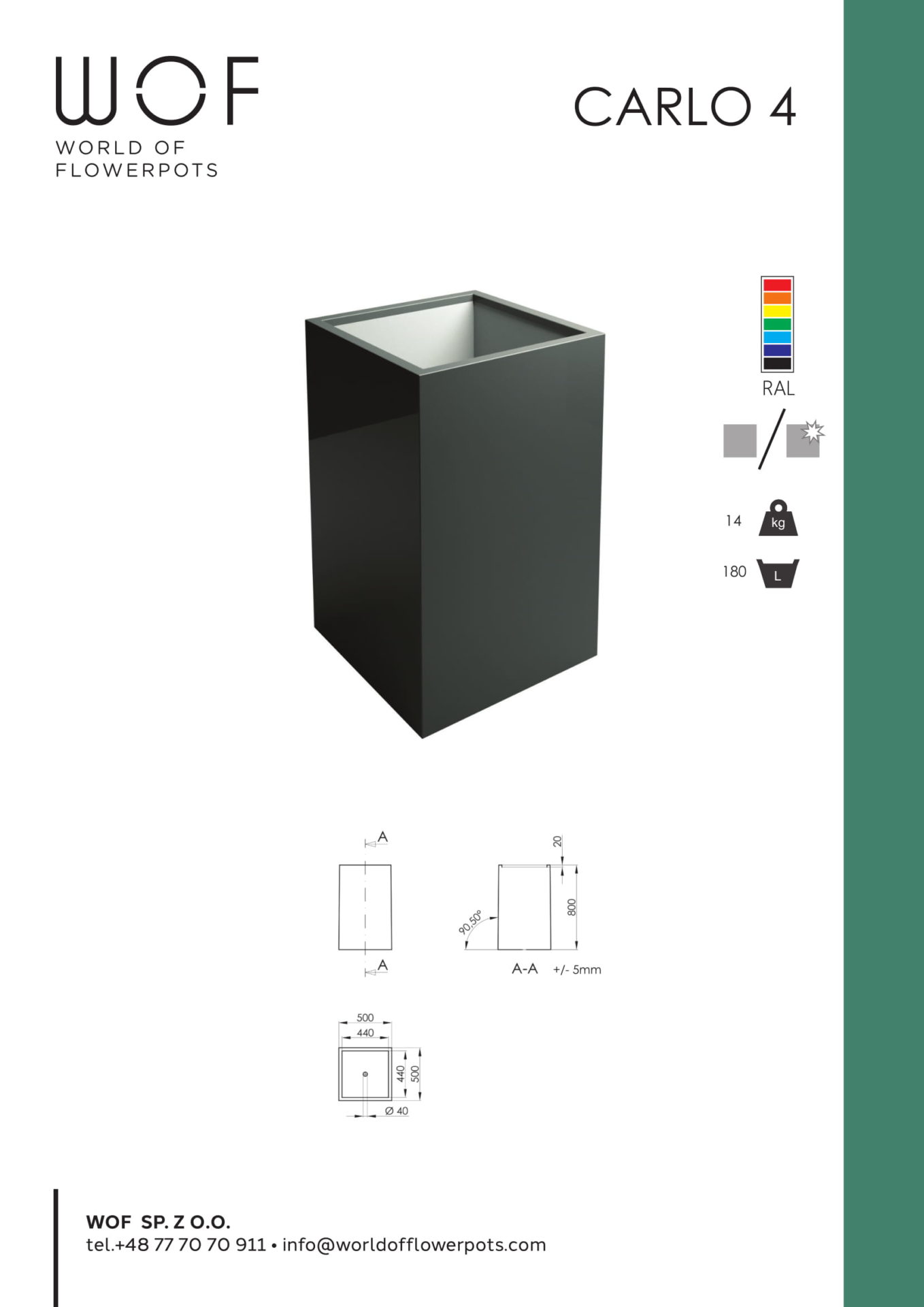Dzięki swoim uniwersalnym rozmiarom i szerokiej gamie kolorystycznej, Carlo 4 stanowi świetny dodatek do przestronnych wnętrz przestrzeni publicznej, np. hoteli oraz biur. Niepowtarzalna struktura donicy sprawia, że jest ona swoistą ozdobą pasującą do wielu stylów aranżacyjnych. Smukłe donice z włókna szklanego będą zatem świetnym wyborem dla wszystkich, którzy cenią sobie wyrazisty charakter wnętrz.